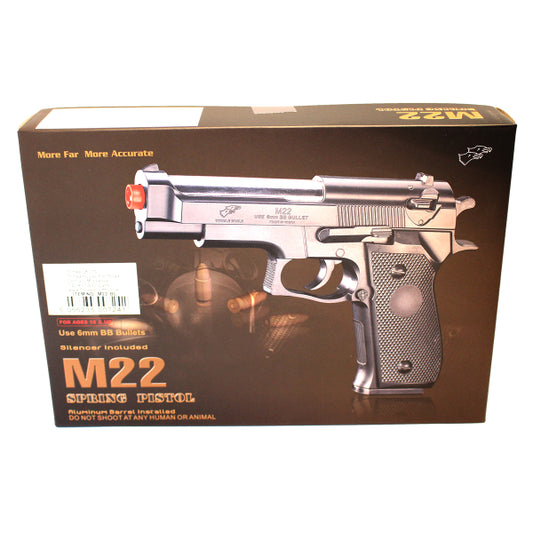 Double Eagle M22 Spring Airsoft Pistol With Suppressor – Two Tone Black/Blue | BB Gun