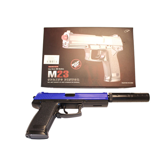 Double Eagle M23 Spring Airsoft Pistol With Suppressor – Two Tone Black/Blue | BB Gun