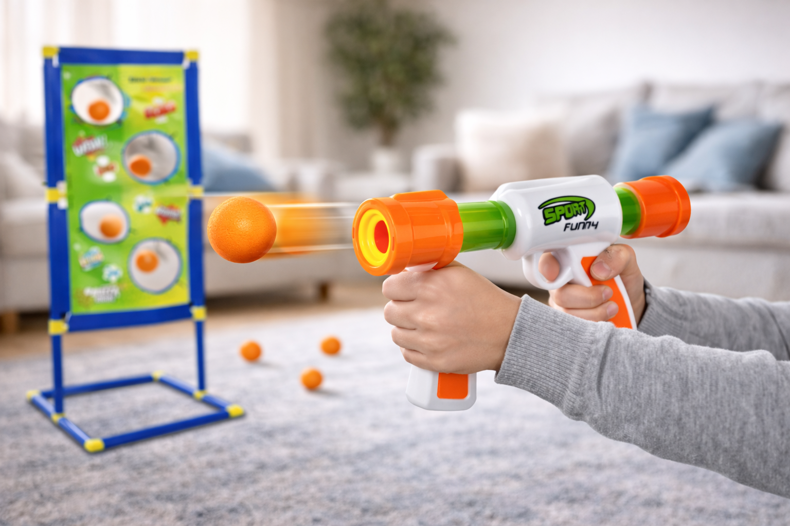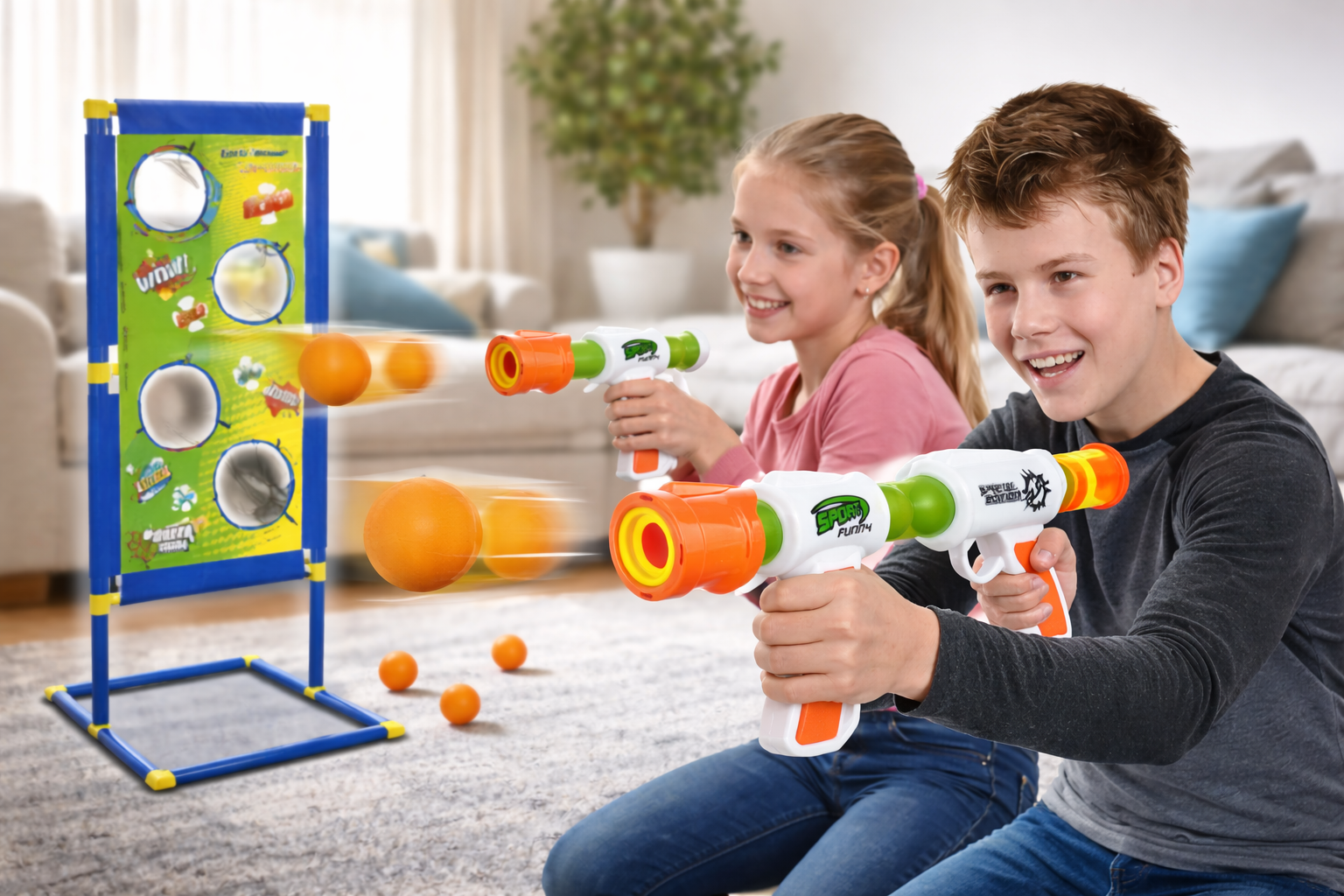The set includes two air popper guns and multiple foam balls, perfect for target practice, competitive play, and family fun. Its lightweight design and soft foam ammo ensure safe play while helping children develop hand-eye coordination and aiming skills.